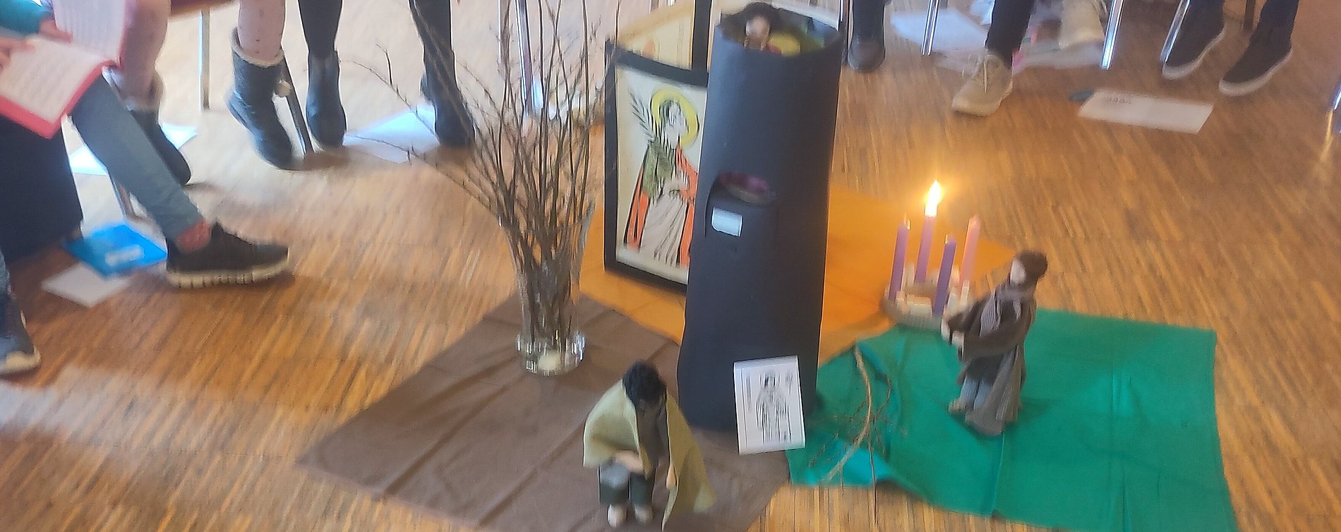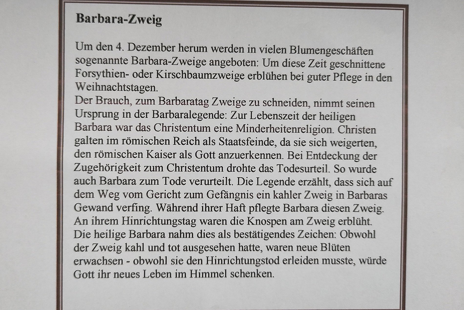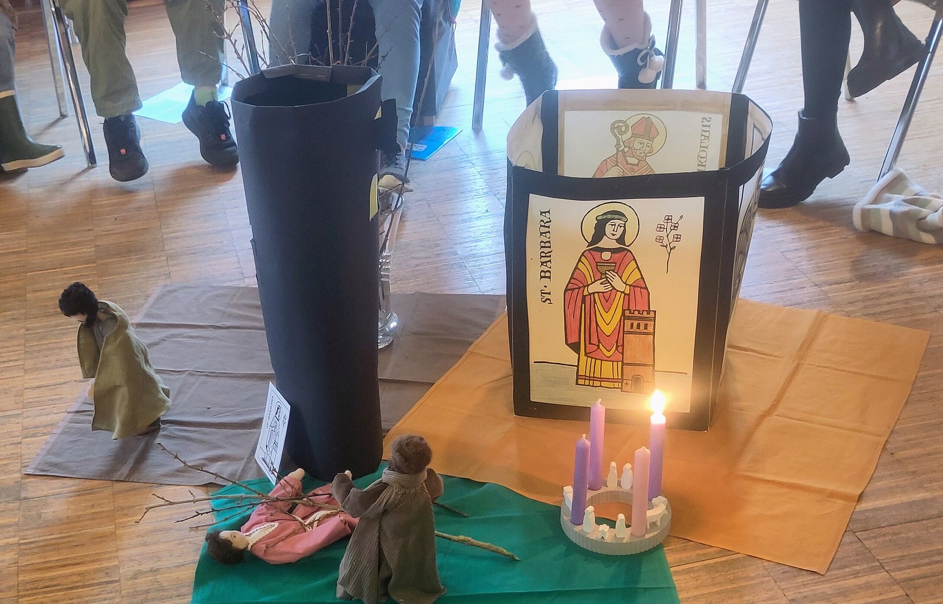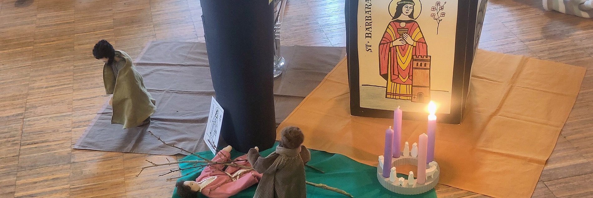 Am ersten Advent stand die heilige Barbara im Mittelpunkt der Kinderkirche. Wir hörten die Legende der Heiligen und brachten dies mit Gott in Verbindung. Mit Hilfe unserer Erzählfiguren und einem Turm aus Pappe veranschaulichten wir die Erzählung. Die Kinder bekamen zum Abschluß noch einen Barbara-Zweig. Dieser erblühte der Legende nach, als sie starb. Wenn wir heute einen Kirschzweig am Barbaratag in eine Vase mit frischem Wasser stellen, erblüht er an Weihnachten.