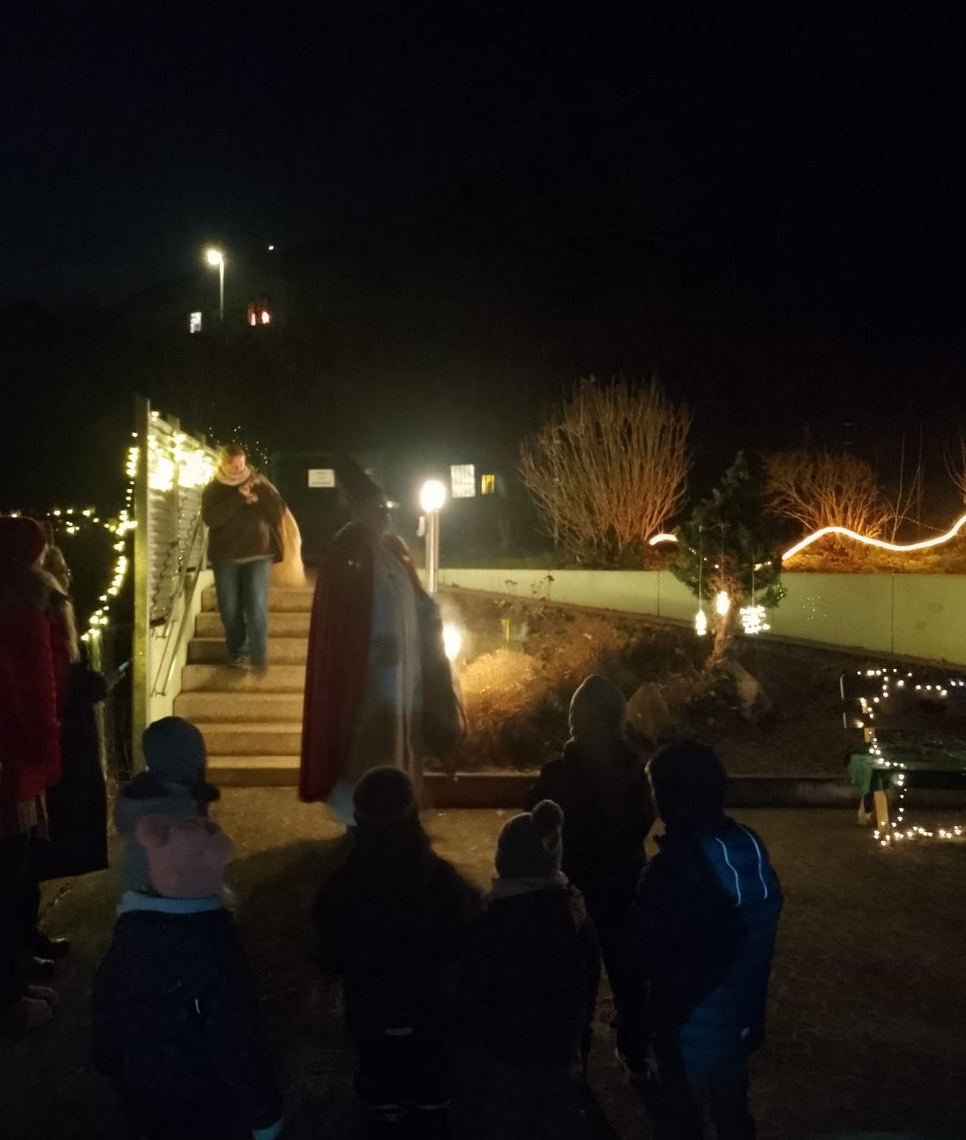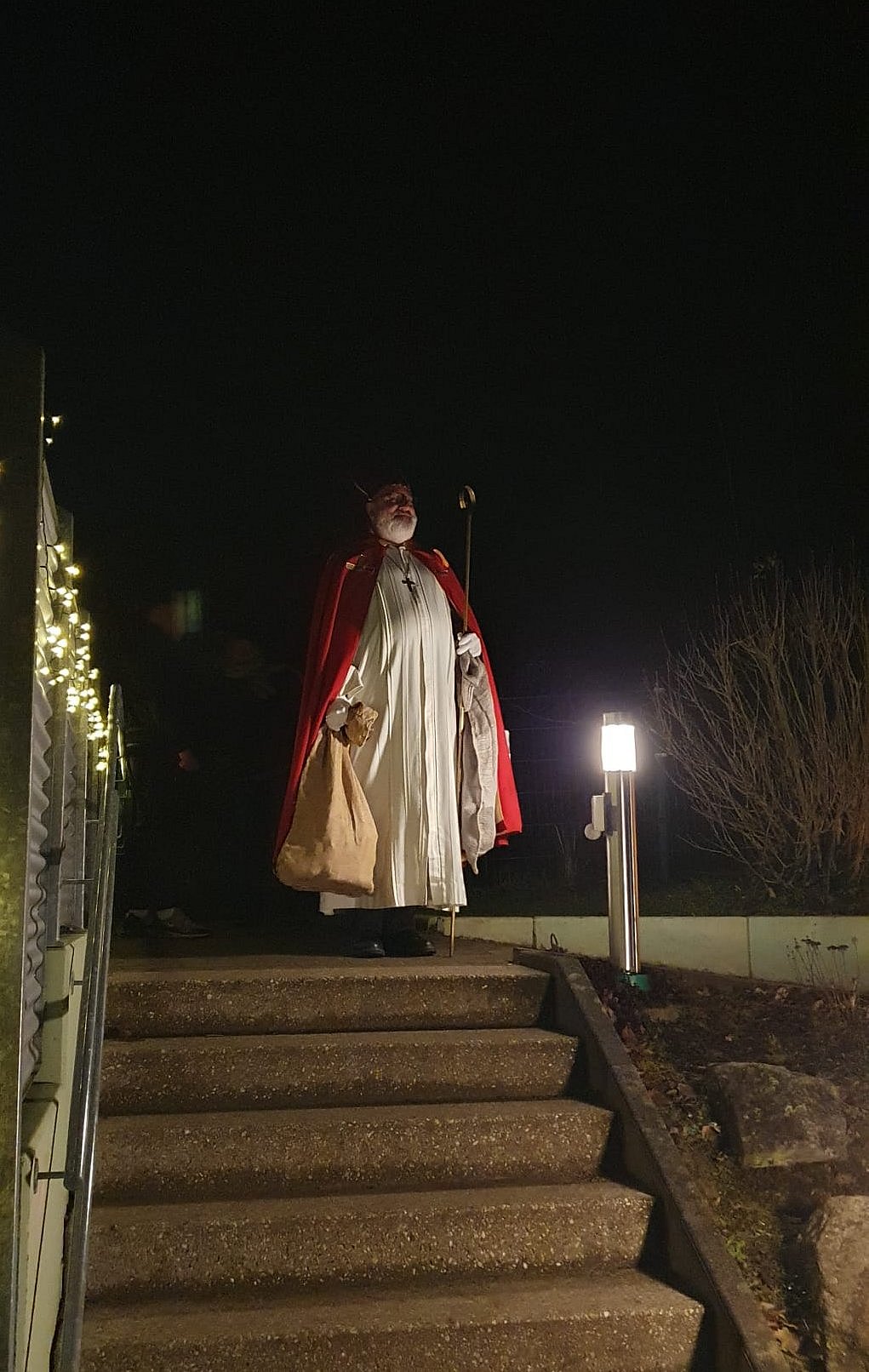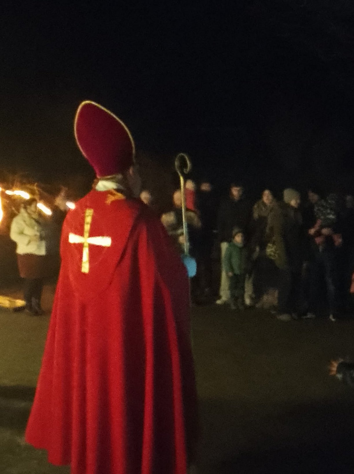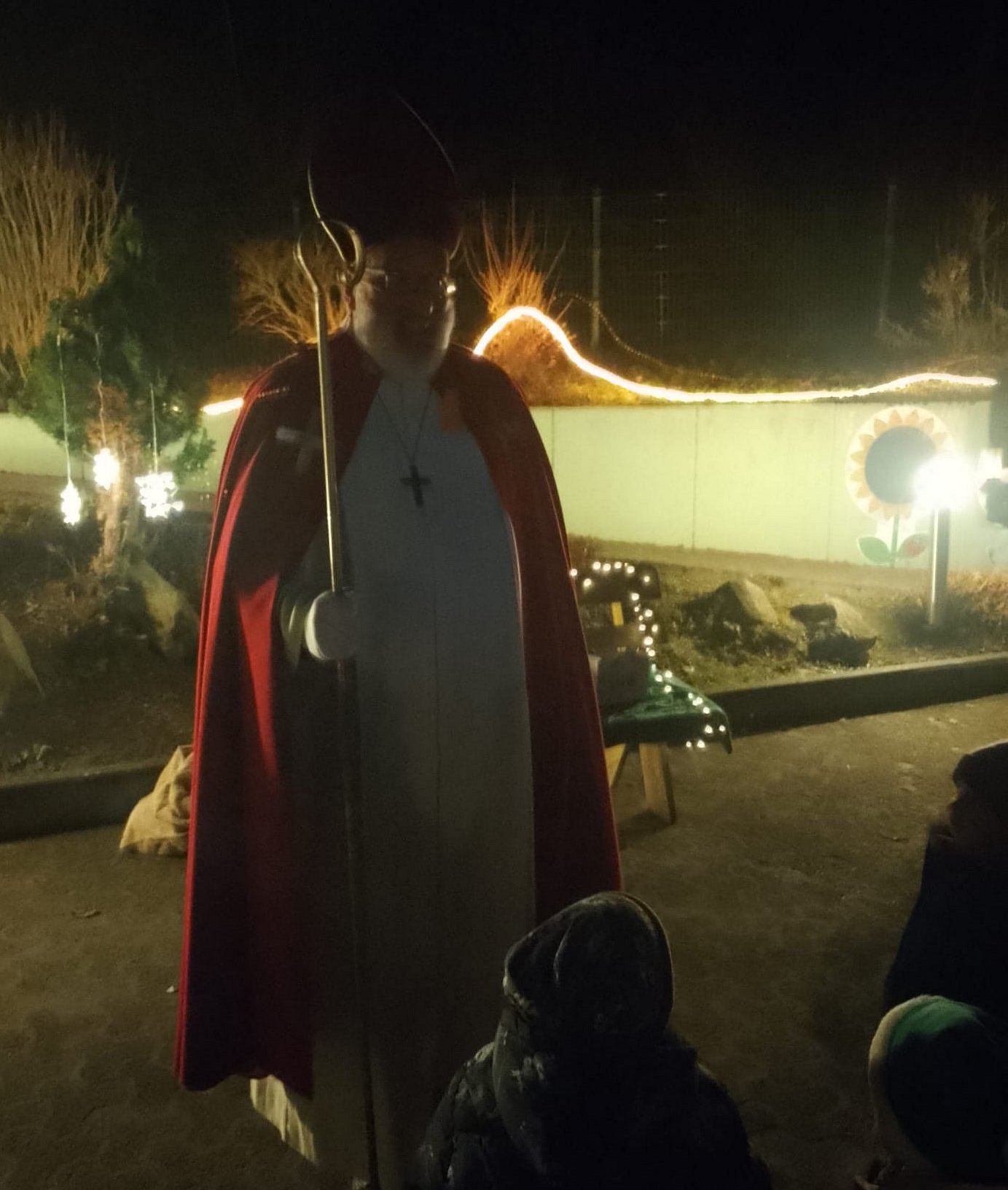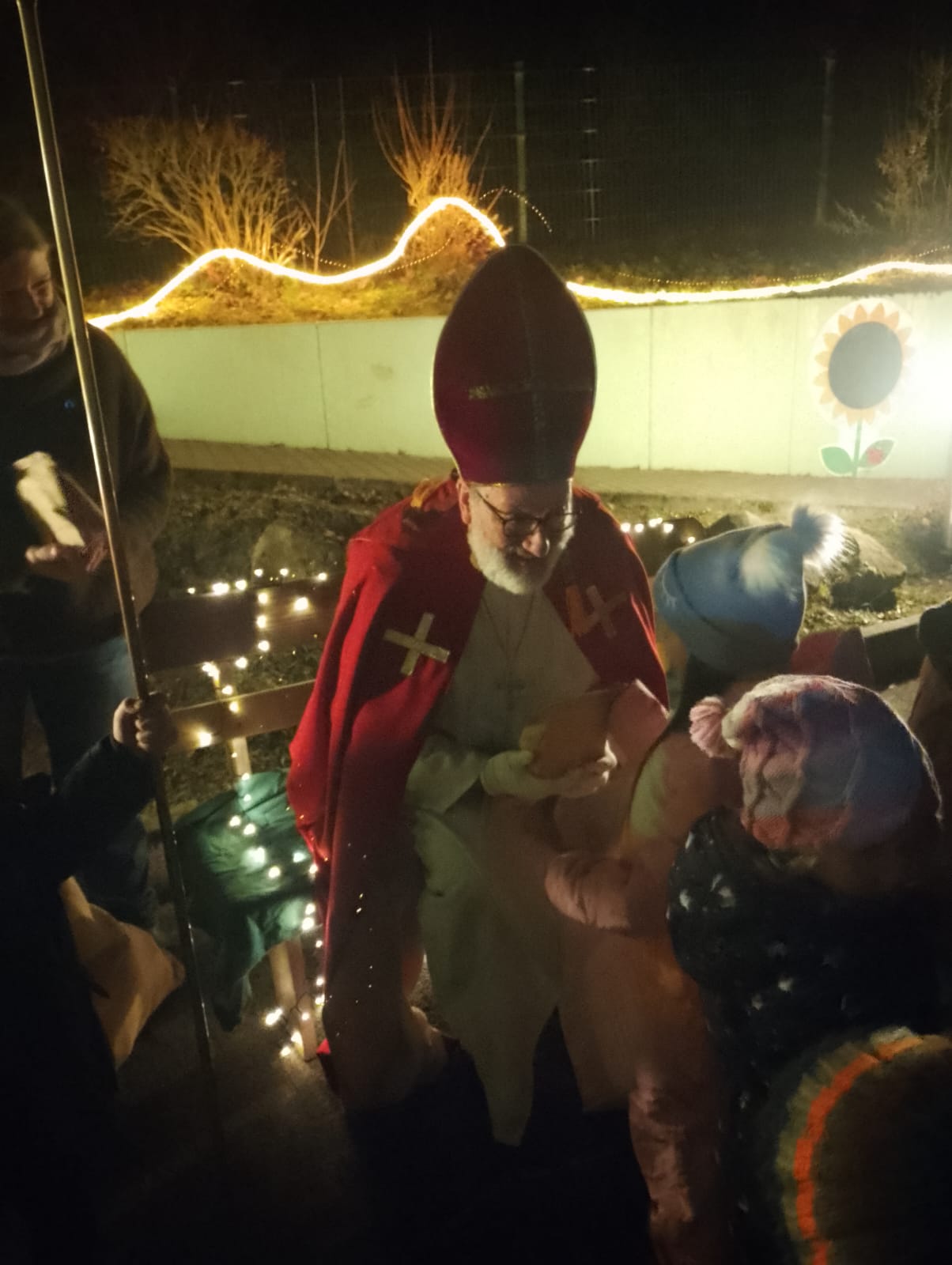 Und dann war es soweit. Groß und stattlich tauchte er aus der Dunkelheit auf. Natürlich wussten die Kinder sofort, dass es der "echte" Nikolaus war, der sie besuchte. Denn sie hatten in den Tagen zuvor schon viel von ihm gehört: Seinem Bischofshut namens Mitra, dem Hirtenstab und dem Bischofsgewand.