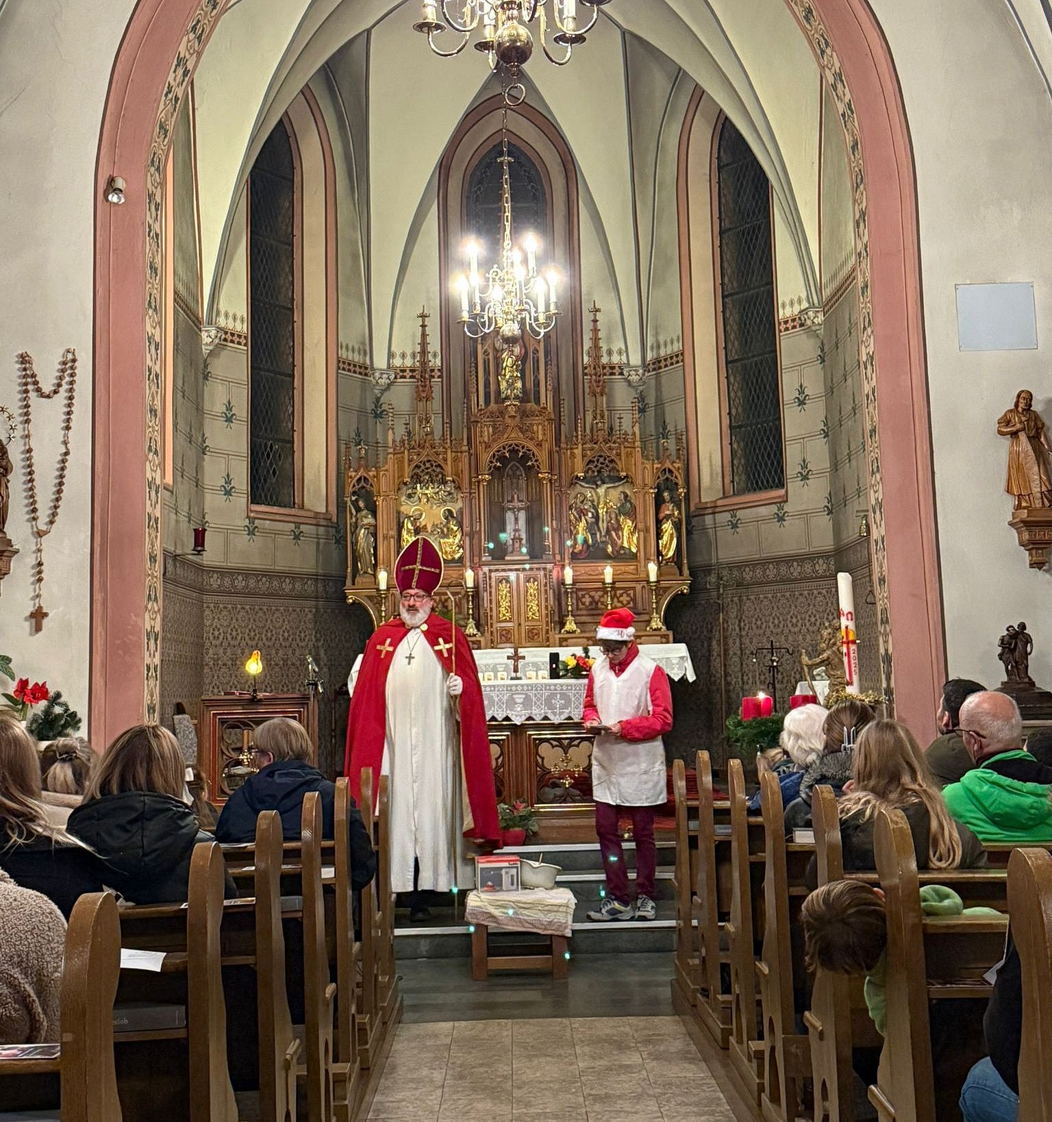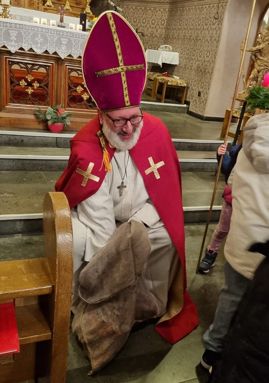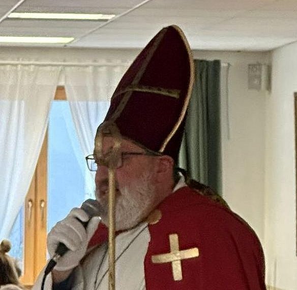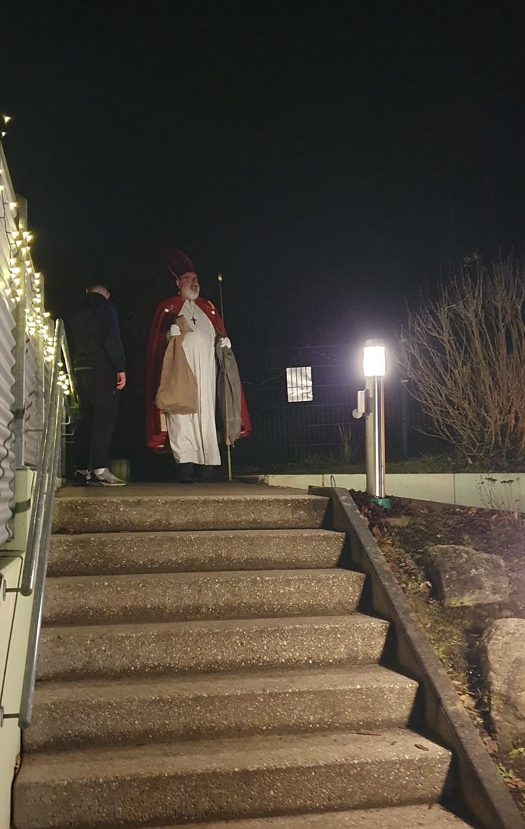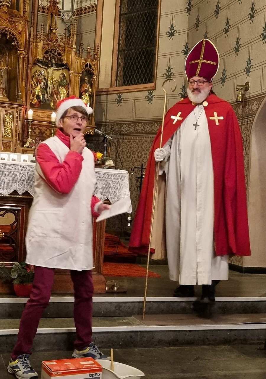 Seinen ersten Besuch im Jahr 2025 führte den Nikolaus zu den Senioren in die AWO Residenz Diez. Manche glaubten dort doch tatsächlich, ihren Seelsorger Hilmar Dutine unter der Mitra und im Bischofsgewand zu erkennen. Doch dieser meinte nur trocken: "Tstststs", als ob Herr Dutine schon jemals so prachtvoll wie er gekleidet wäre. Und nahm dies gleich zum Anlass, den Unterschied zwischen der Weihnachtsmann- und der Nikolauskleidung zu erklären.