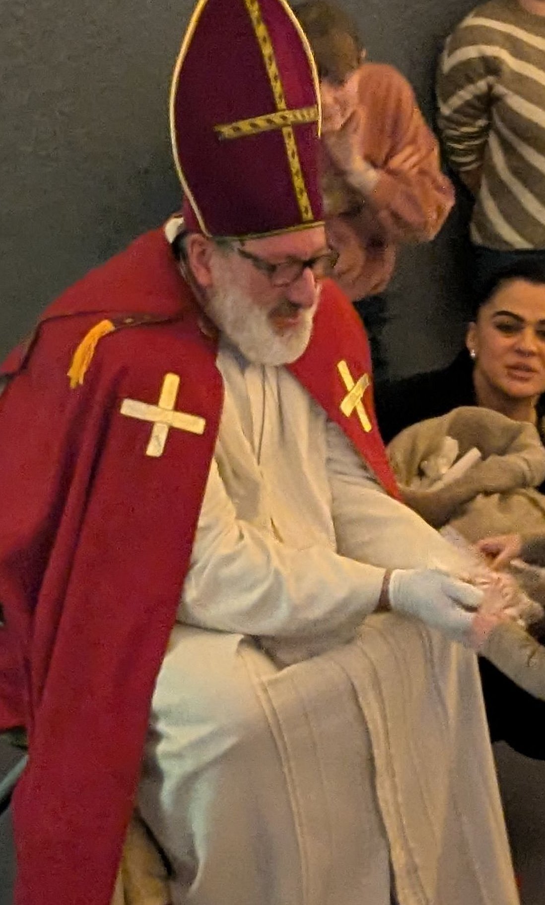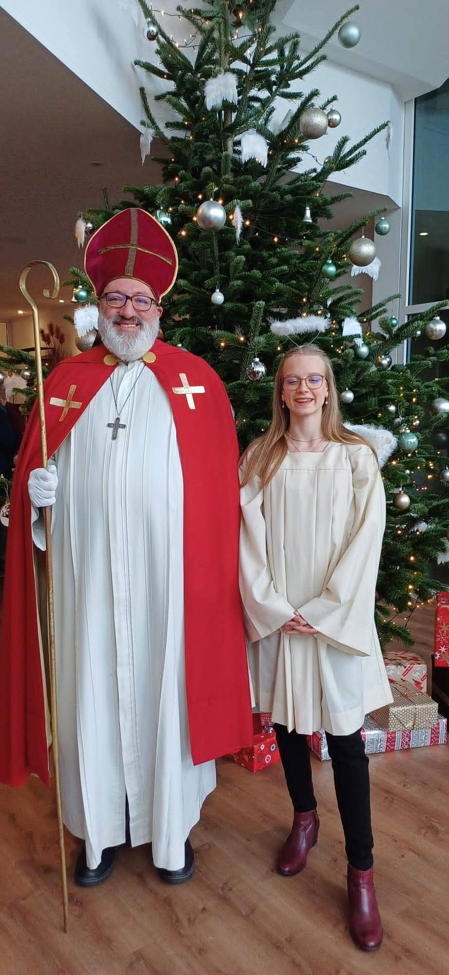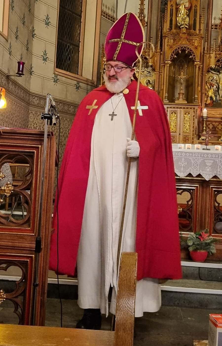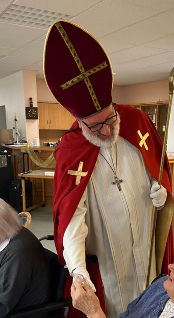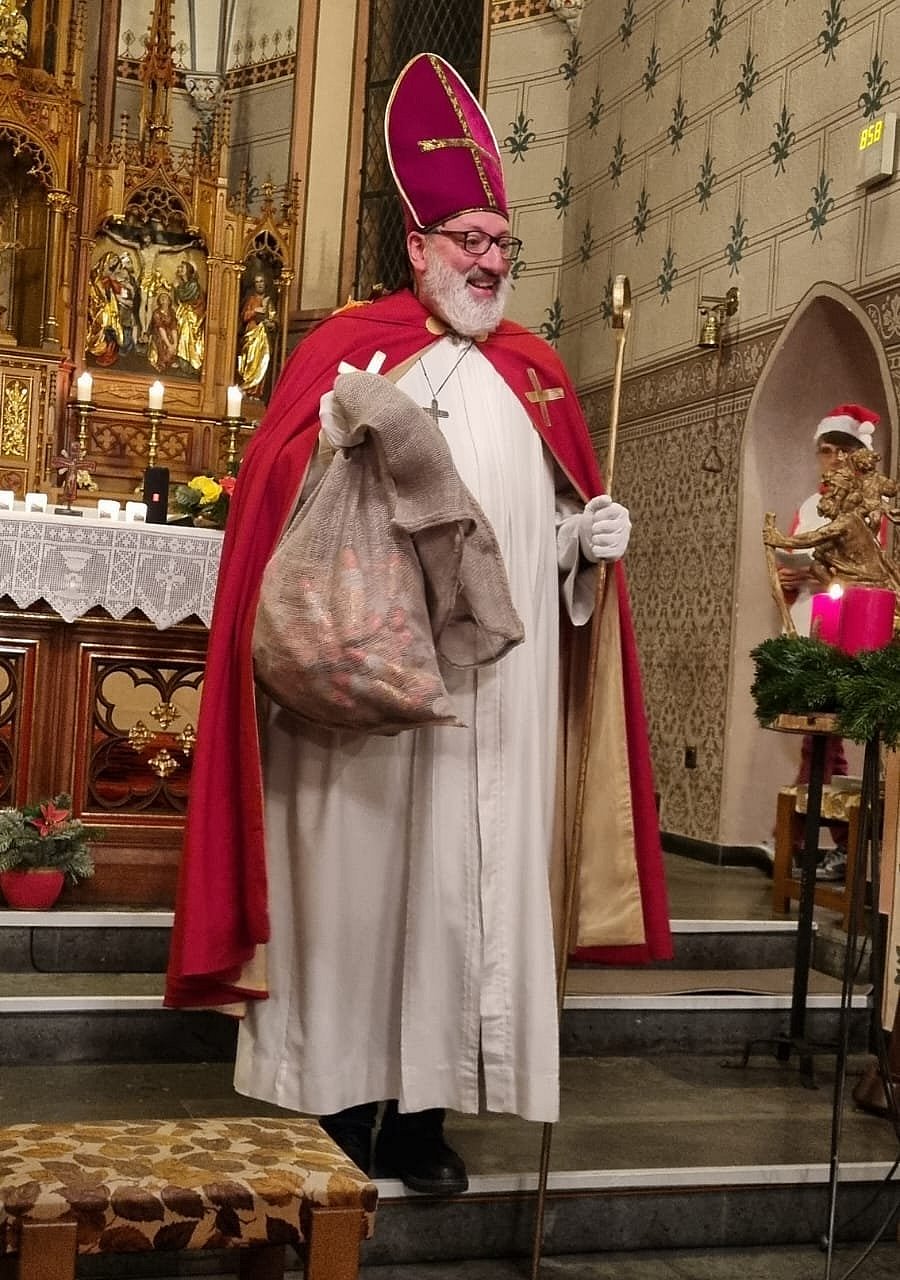 Seinen ersten Besuch im Jahr 2025 führte den Nikolaus zu den Senioren in die AWO Residenz Diez. Manche glaubten dort doch tatsächlich, ihren Seelsorger Hilmar Dutine unter der Mitra und im Bischofsgewand zu erkennen. Doch dieser meinte nur trocken: "Tstststs", als ob Herr Dutine schon jemals so prachtvoll wie er gekleidet wäre. Und nahm dies gleich zum Anlass, den Unterschied zwischen der Weihnachtsmann- und der Nikolauskleidung zu erklären.