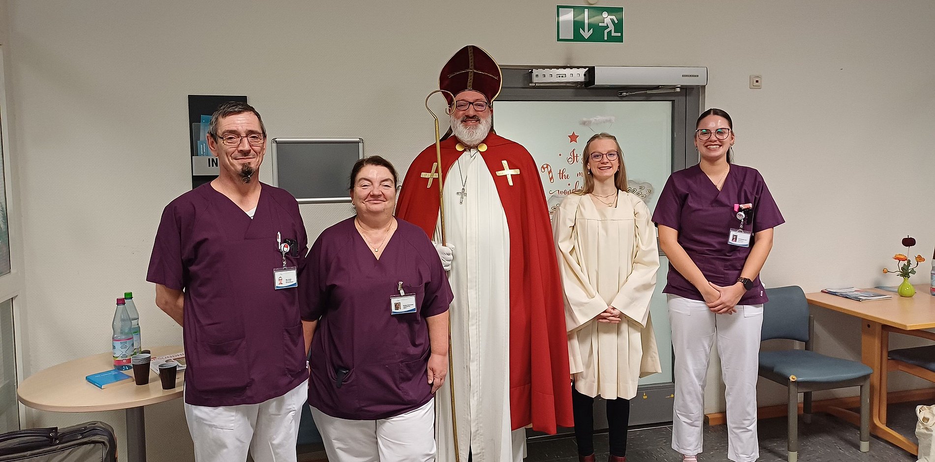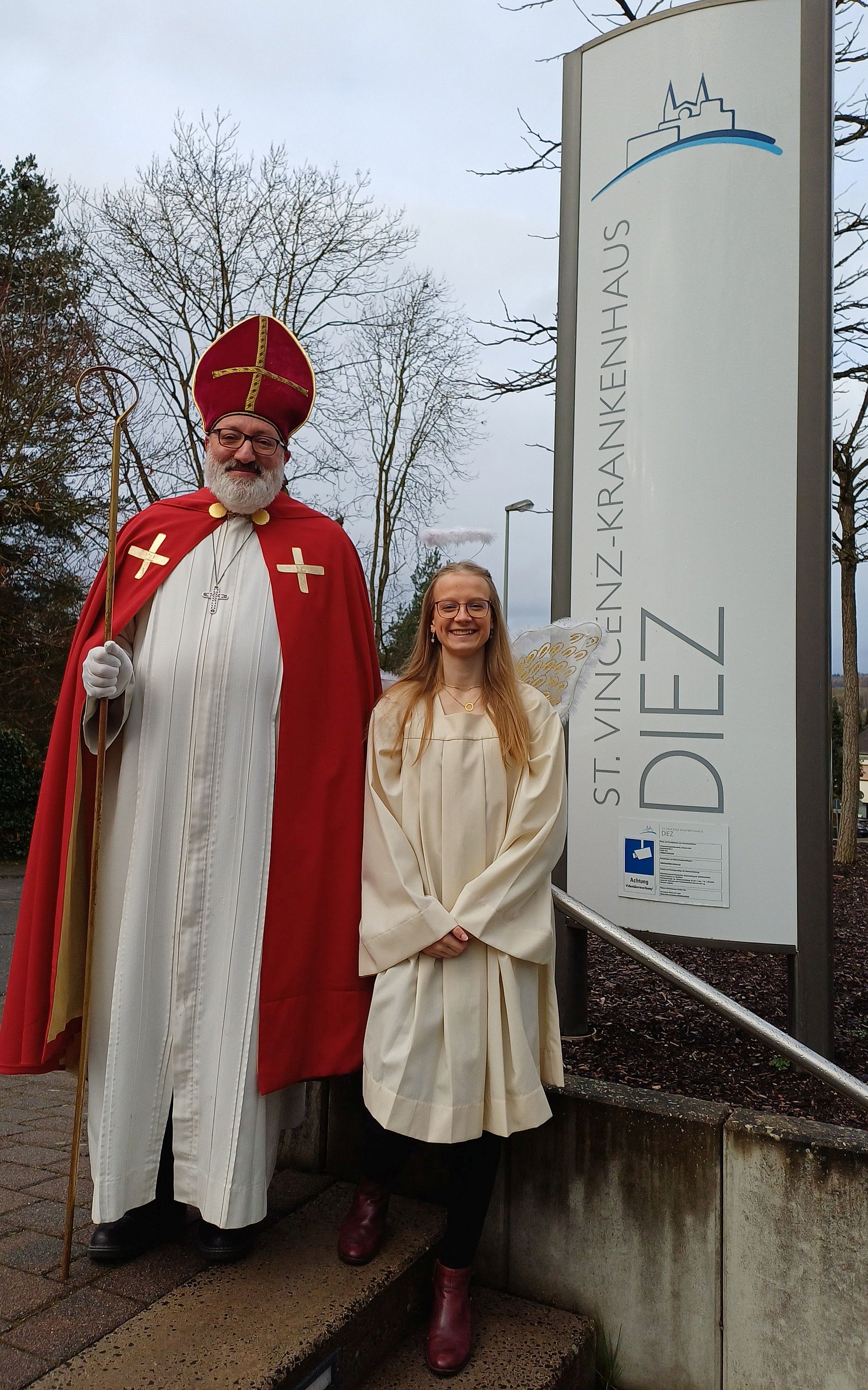 Am Nikolaustag führte es unseren Heiligen an den Ort, an dem Krankheit und Genesung eine wichtige Rolle spielen: ins St. Vincenzkrankenhaus Diez. Unterstützung bekam er dabei von einem Weihnachtsengel. Und wenn sie an den Zimmertüren anklopften und in die Räume eintraten, huschte ein Strahlen über das Gesicht der meisten Patienten und Patientinnen. "Sie sind die schönste Überraschung, die mir heute passieren konnte", hörten Nikolaus und sein Engel nicht nur einmal. Als kleines Präsent schenkten sie den Patienten und natürlich auch deren Besucher sowie dem Klinikpersonal kleine Holzengel-Anhänger. "Der bekommt einen Ehrenplatz am Baum zu Hause", versprach eine Patientin.