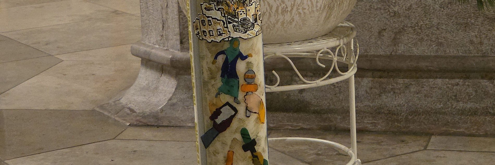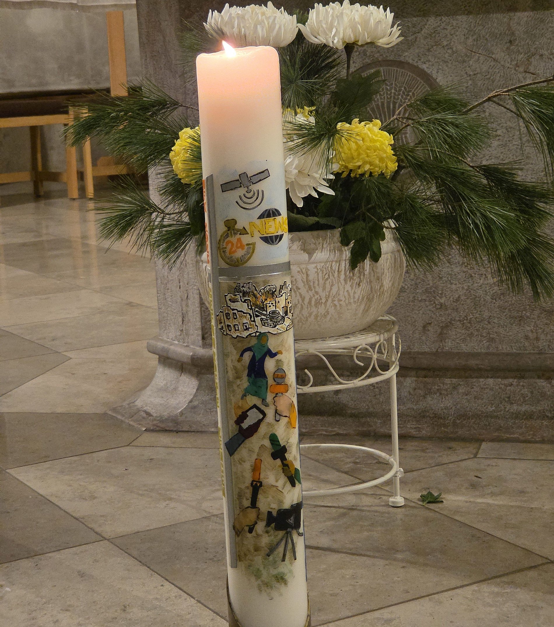 In unserer Gemeinde wurde die Kerze am 8.11. in der Vorabendmesse in Diez übergeben von Hilturd B. von der Kolpingsfamilie Kiedrich im Rheingau, wo die Kerze vorher in einem Friedensgebet gebrannt hatte.