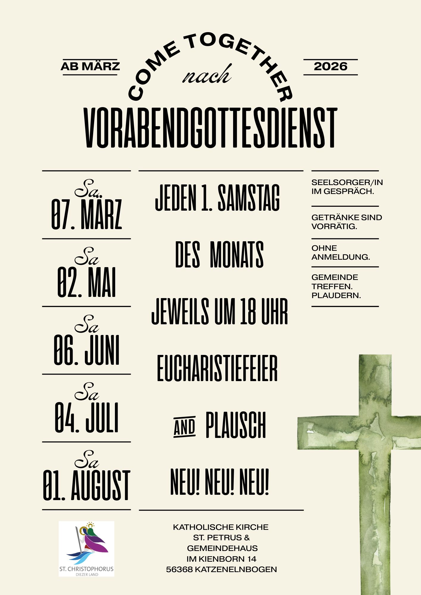 Nach einer Anregung aus dem Ortsausschuss Katzenelnbogen und Beschluss durch den Pfarrgemeinderat der Pfarrei St. Christophorus Diezer Land ist ab März der katholische Gottesdienst in Katzenelnbogen jeweils am 1. Wochenende des Monats als Vorabendgottesdienst samstags um 18 h. Im Gegenzug hat dann der Kirchort Zollhaus seinen Gottesdienst am 1. Wochenende des Monats am Sonntag um 9.30 h.