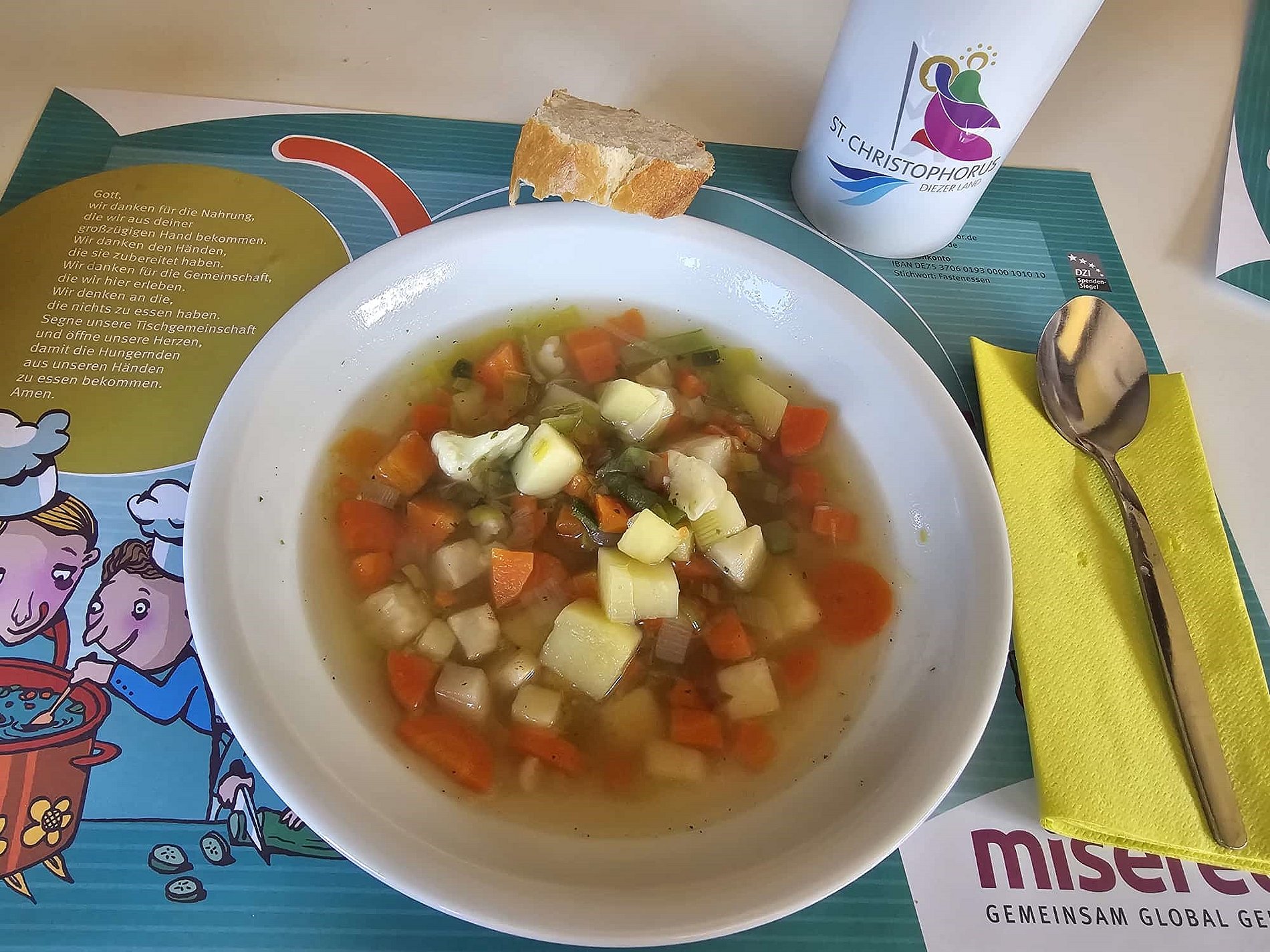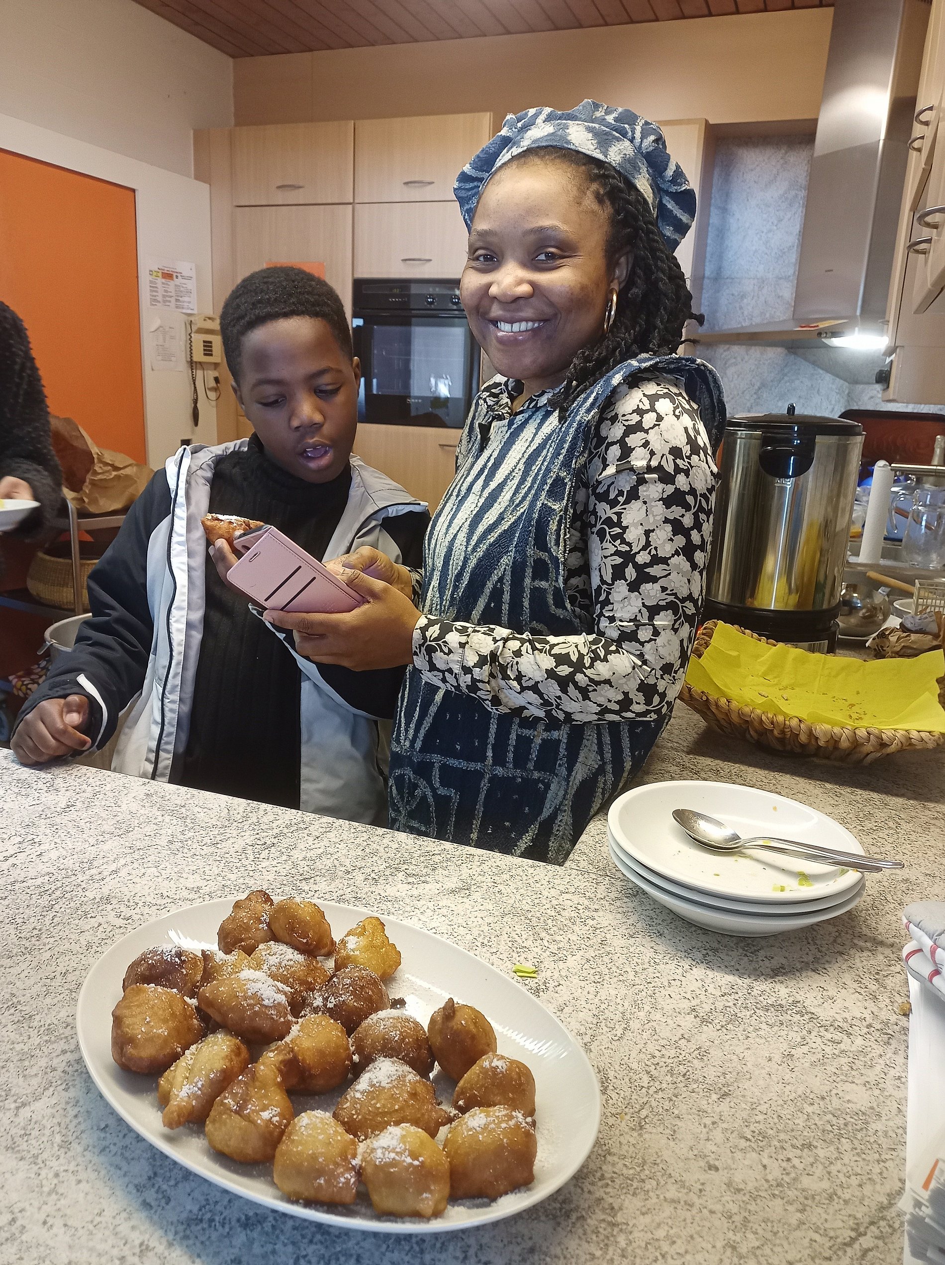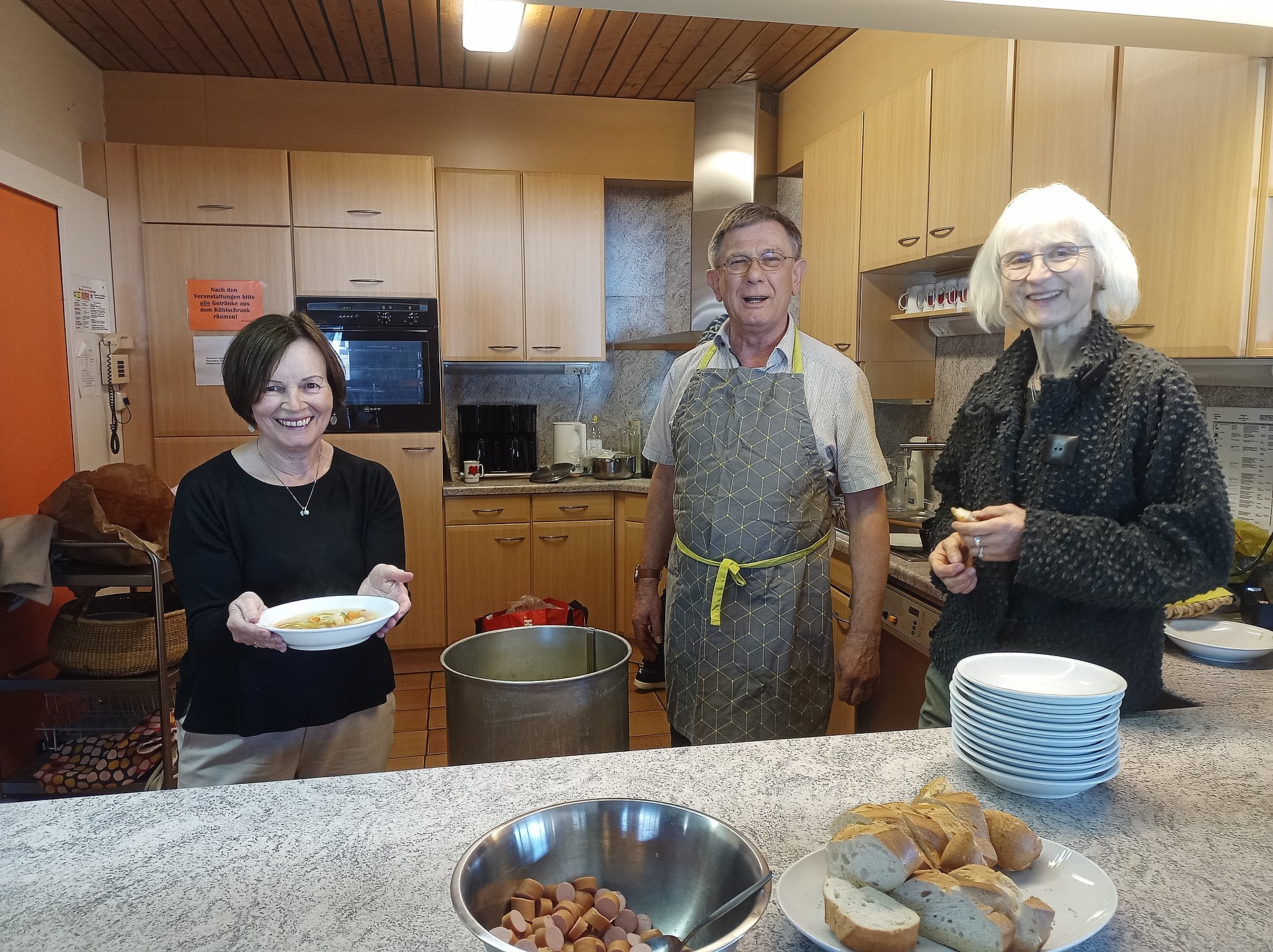 Anschließend gab es ein Fastenessen im Gemeindesaal. Der Ortsausschuss hatte dazu eingeladen, geputztes und geschnippeltes Gemüse von zu Hause mitzubringen. Während des Gottesdienstes wurde dann daraus eine leckere Suppe gekocht, die durch Würstchen und Baguette ergänzt wurde. Viele Menschen aus der Gemeinde, die am Gottesdienst teilgenommen hatten, nahmen die Einladung an und konnten sich dann direkt an den gedeckten Tisch setzen. Zum Nachtisch spendierte Frau T. eine Art Krapfen aus Kamerun, frisch zubereitet in der Küche. Sehr lecker!
