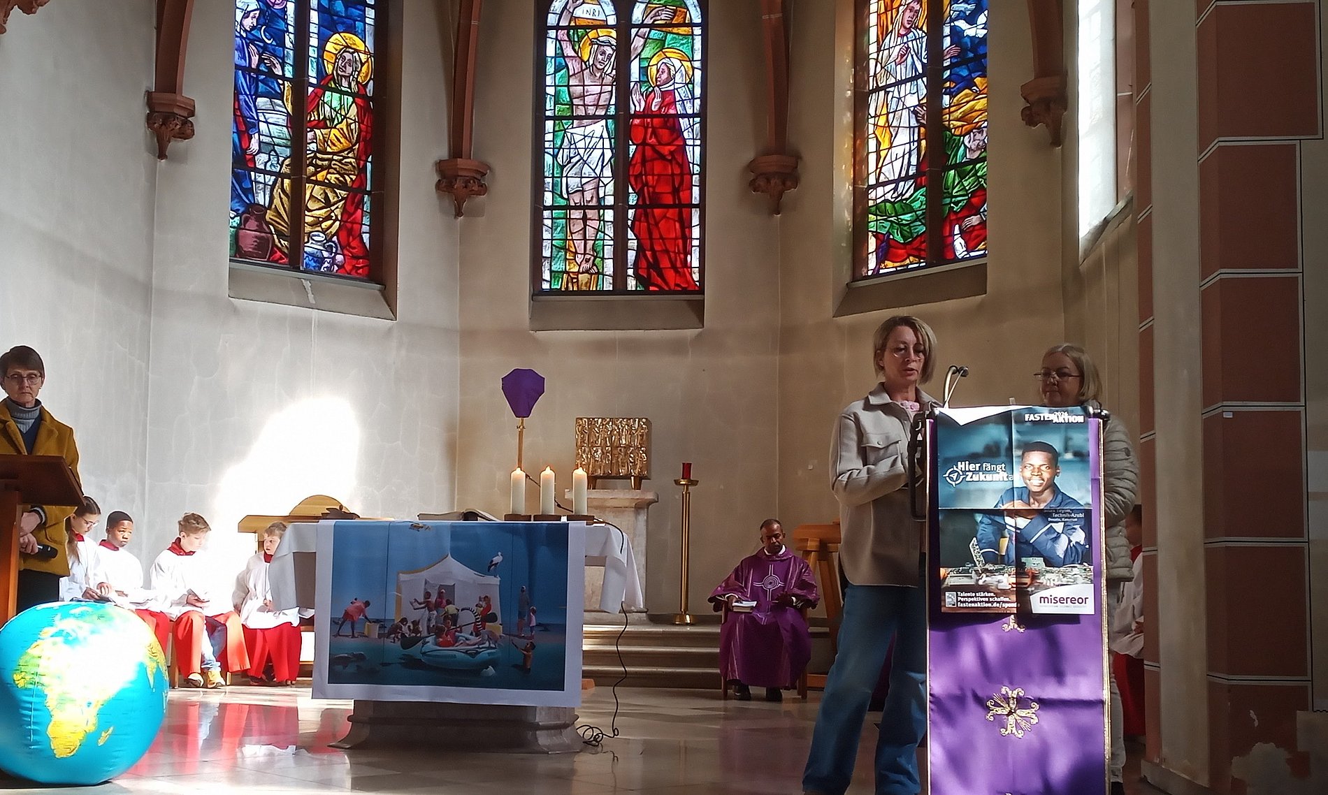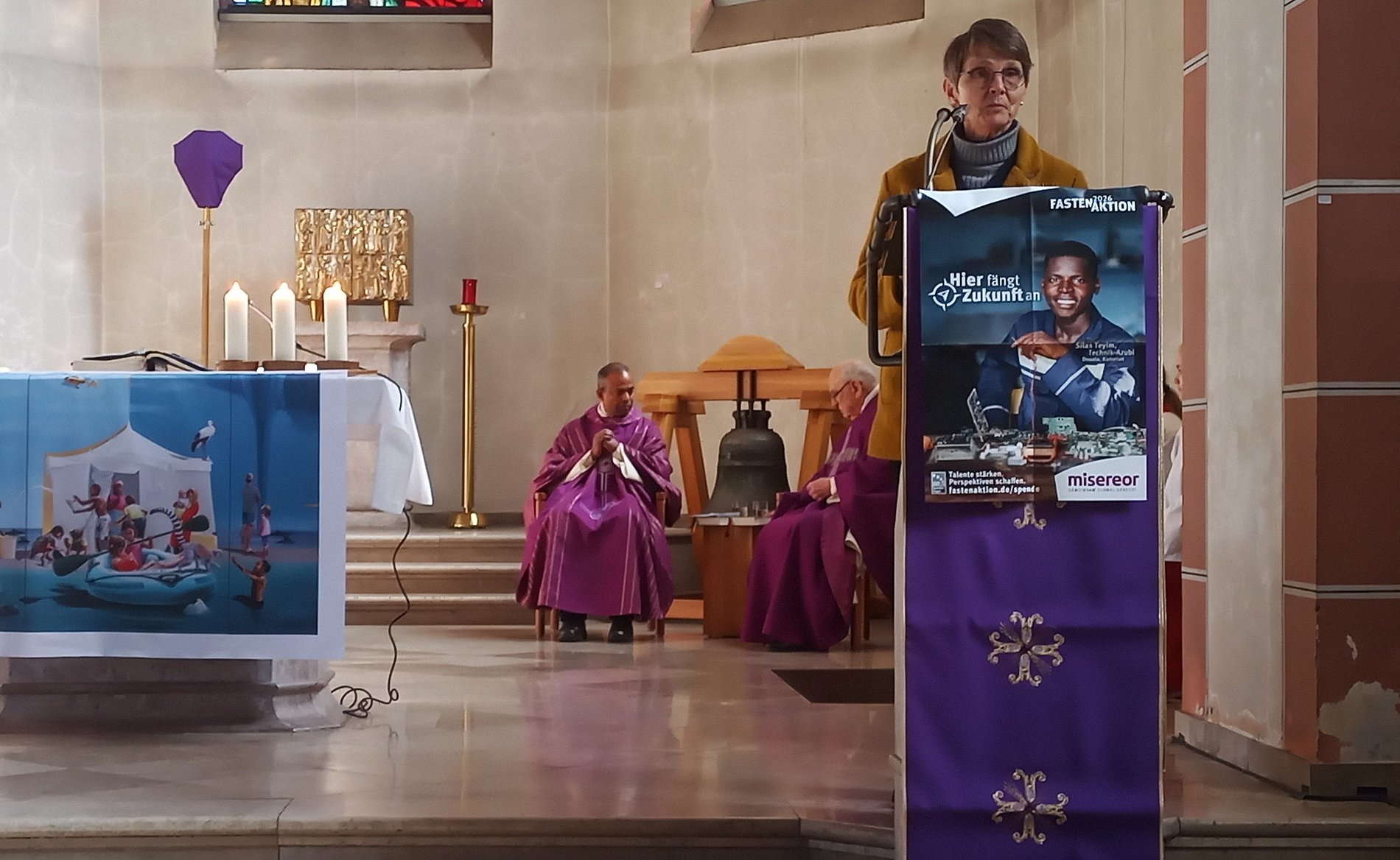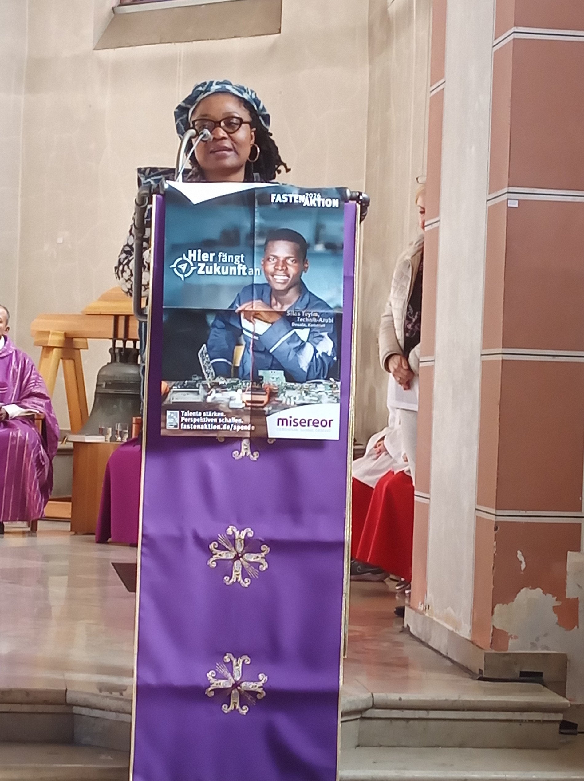 Es ging um Projekte der beruflichen Bildung. So wie Lazarus im Evangelium aus dem Tod auferweckt wird und neues Leben geschenkt bekommt, erhalten junge Menschen durch Bildung Lebensperspektiven. Fr. Stump hatte den kurzweiligen und motivierenden Gottesdienst mit drei Frauen vorbereitet, eine davon aus dem diesjährigen Schwerpunktland Kamerun. Sie konnte über ihre eigene Erfahrung als junger Mensch in diesem Land berichten. Zudem betrachteten wir gemeinsam das Misereor-Hungertuch.