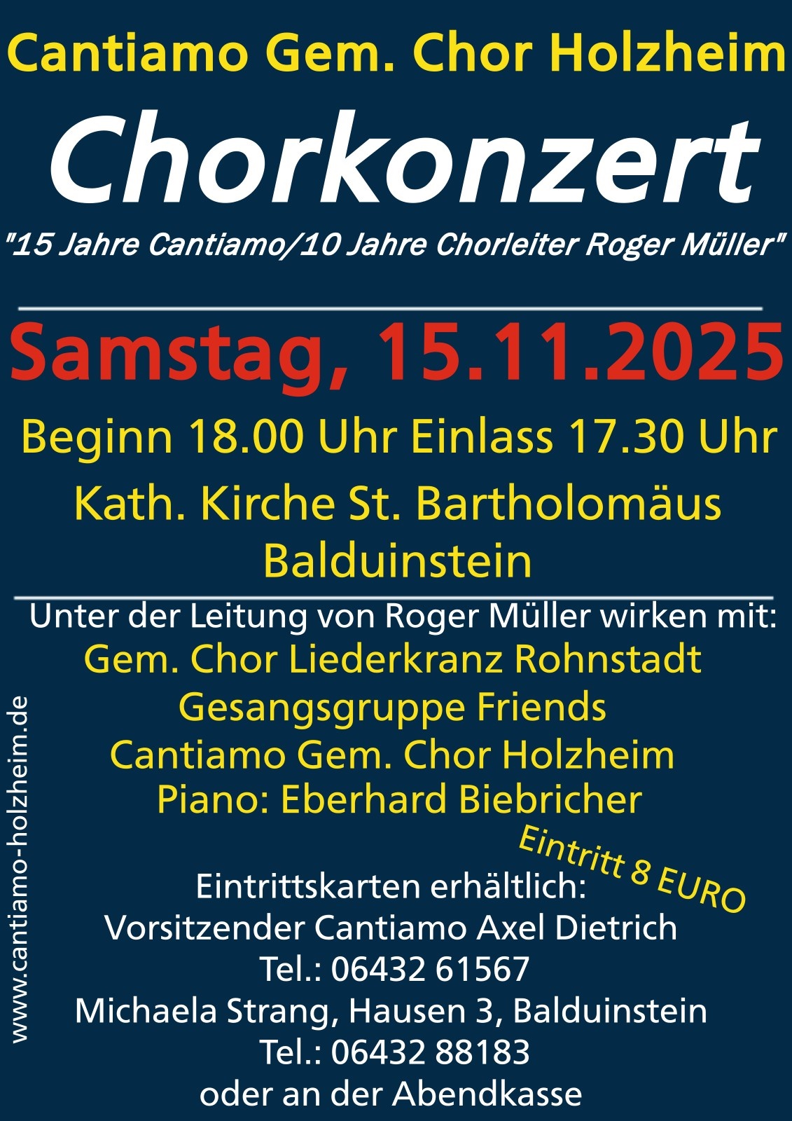 Samstag, 15.11.2025 um 18 Uhr in St. Bartholomäus Balduinstein 15 Jahre Cantiamo und 10 Jahre Chorleiter Roger Müller