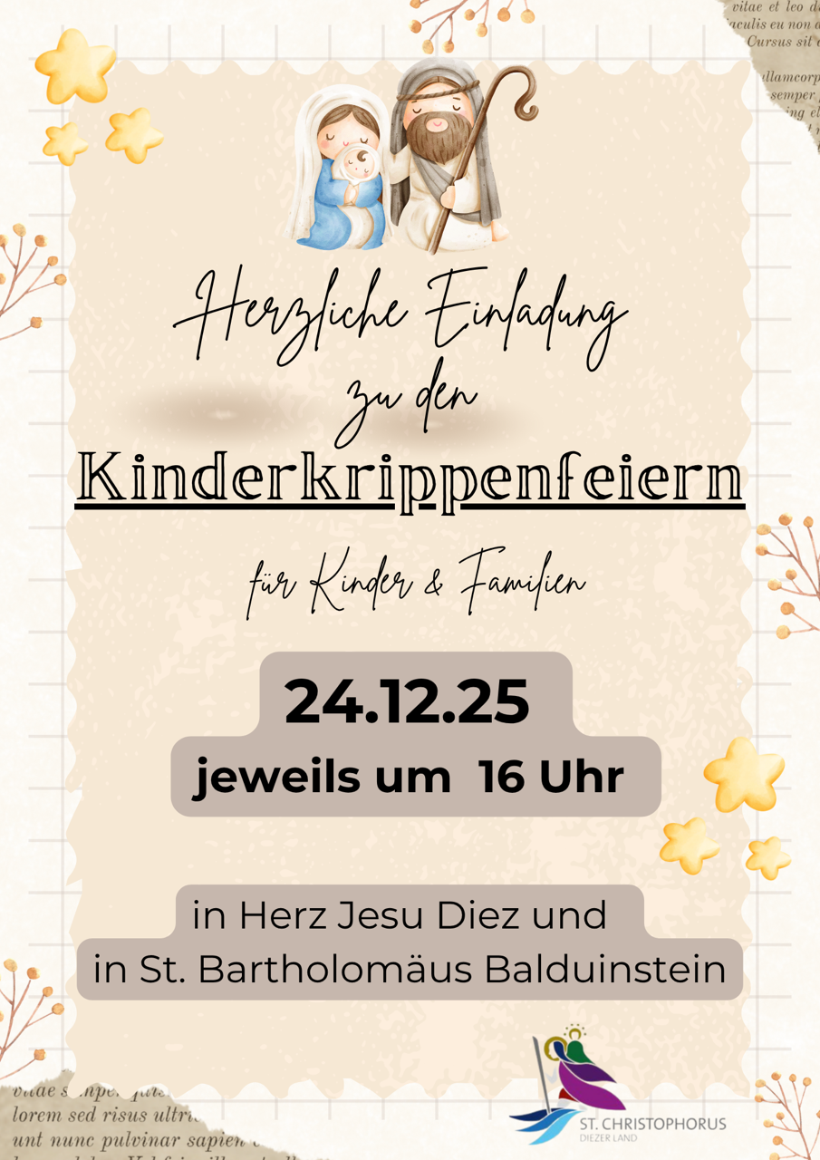 An Heilig Abend finden um 16 Uhr in St. Bartholomäus Balduinstein und Herz Jesu Diez unsere traditionelle Kinderkrippenfeiern statt.